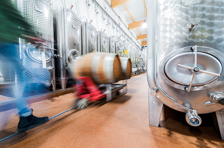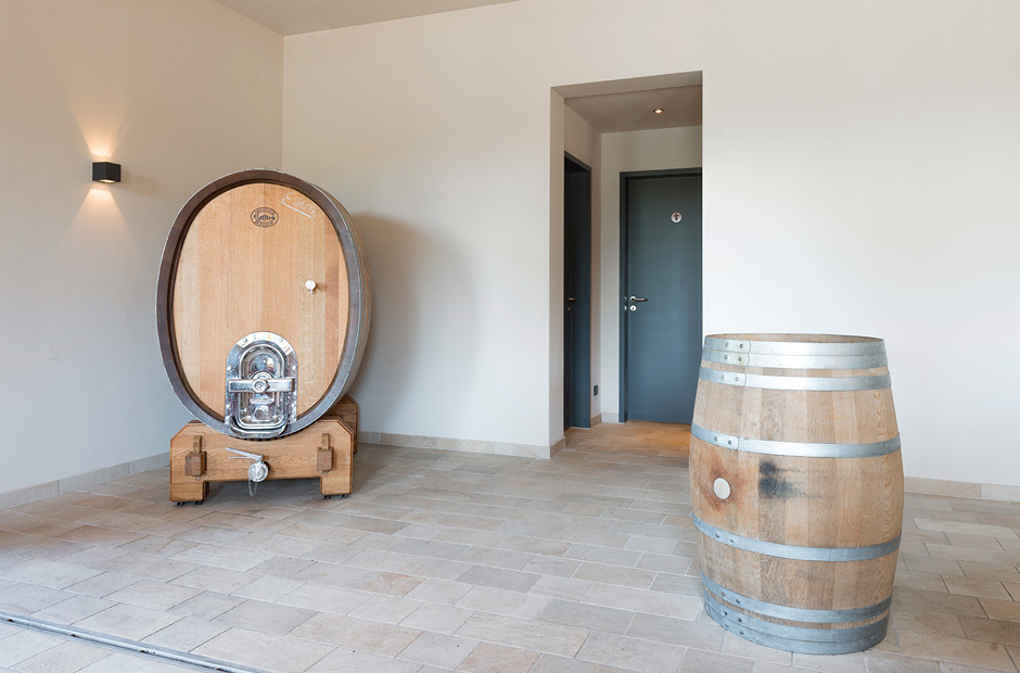 Das hoch-wärmegedämmte Gebäude kommt ohne Heizung aus, massive KS-Wände mit WDVS stellen das Optimum für Weinherstellung und Lagerung dar, eine Lüftungsanlage sorgt für Frischluftzufuhr und ausreichenden Luftwechsel.